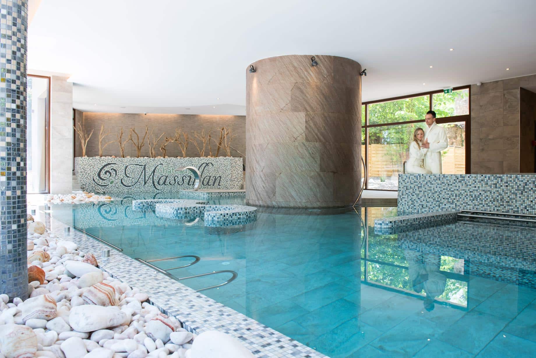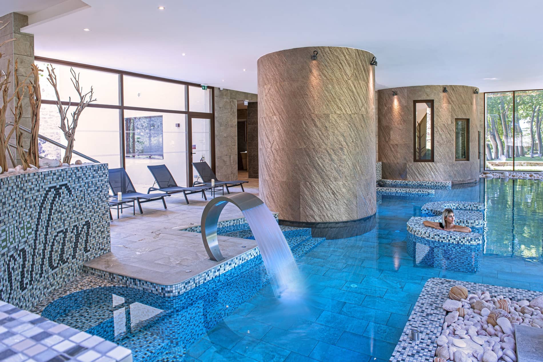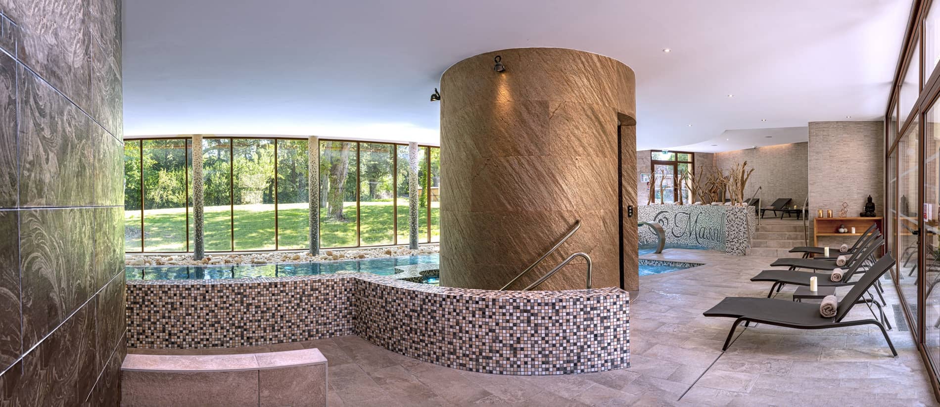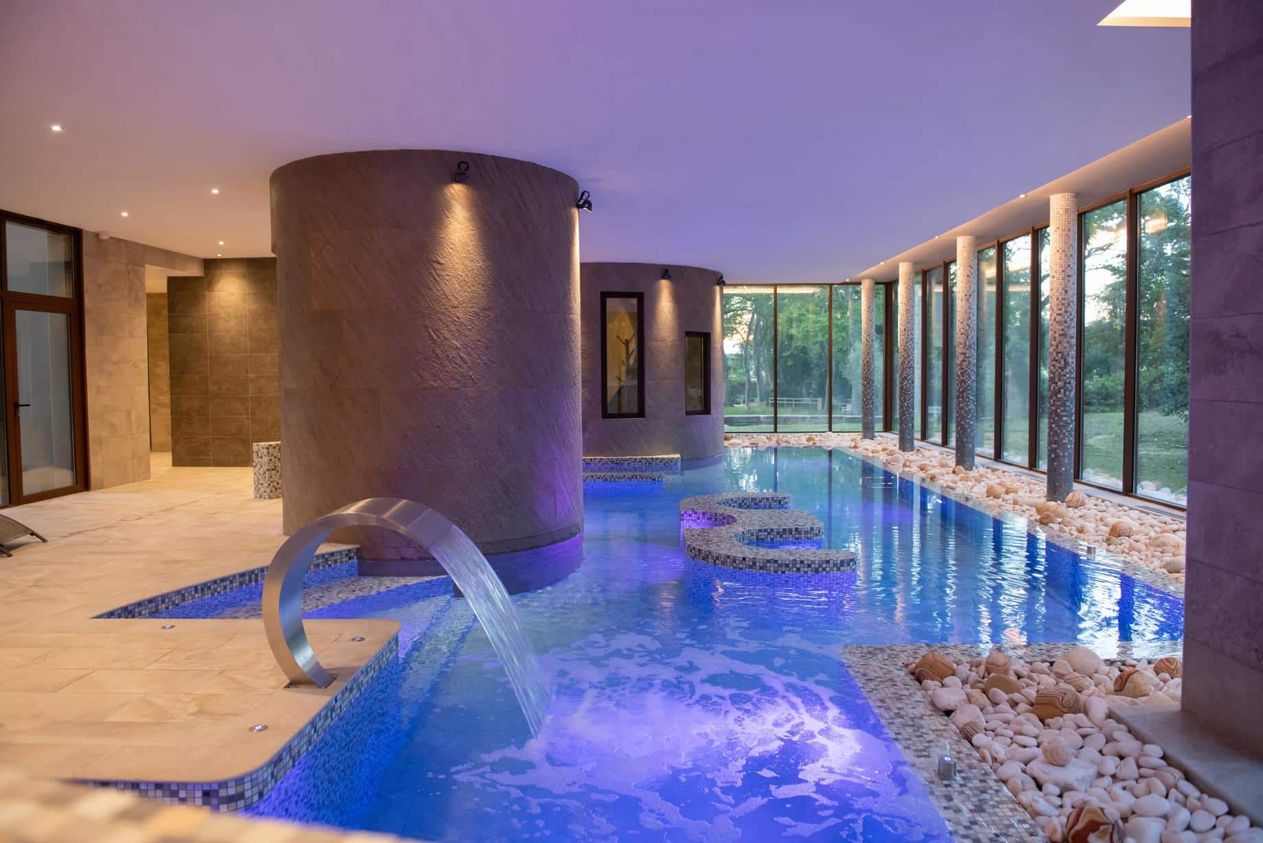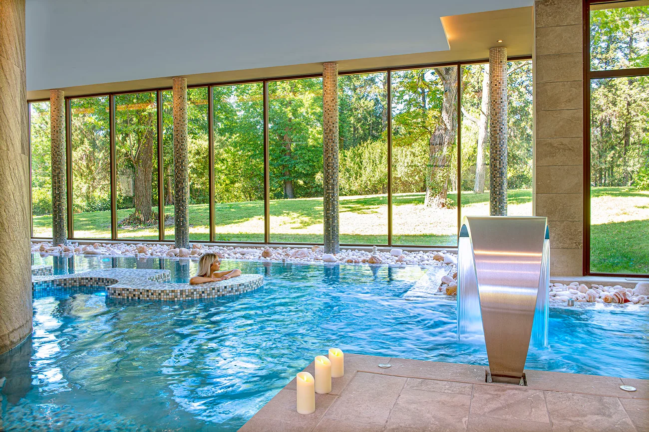 Piscine intérieure du Bio Spa avec grande baie vitrée donnant sur le parc