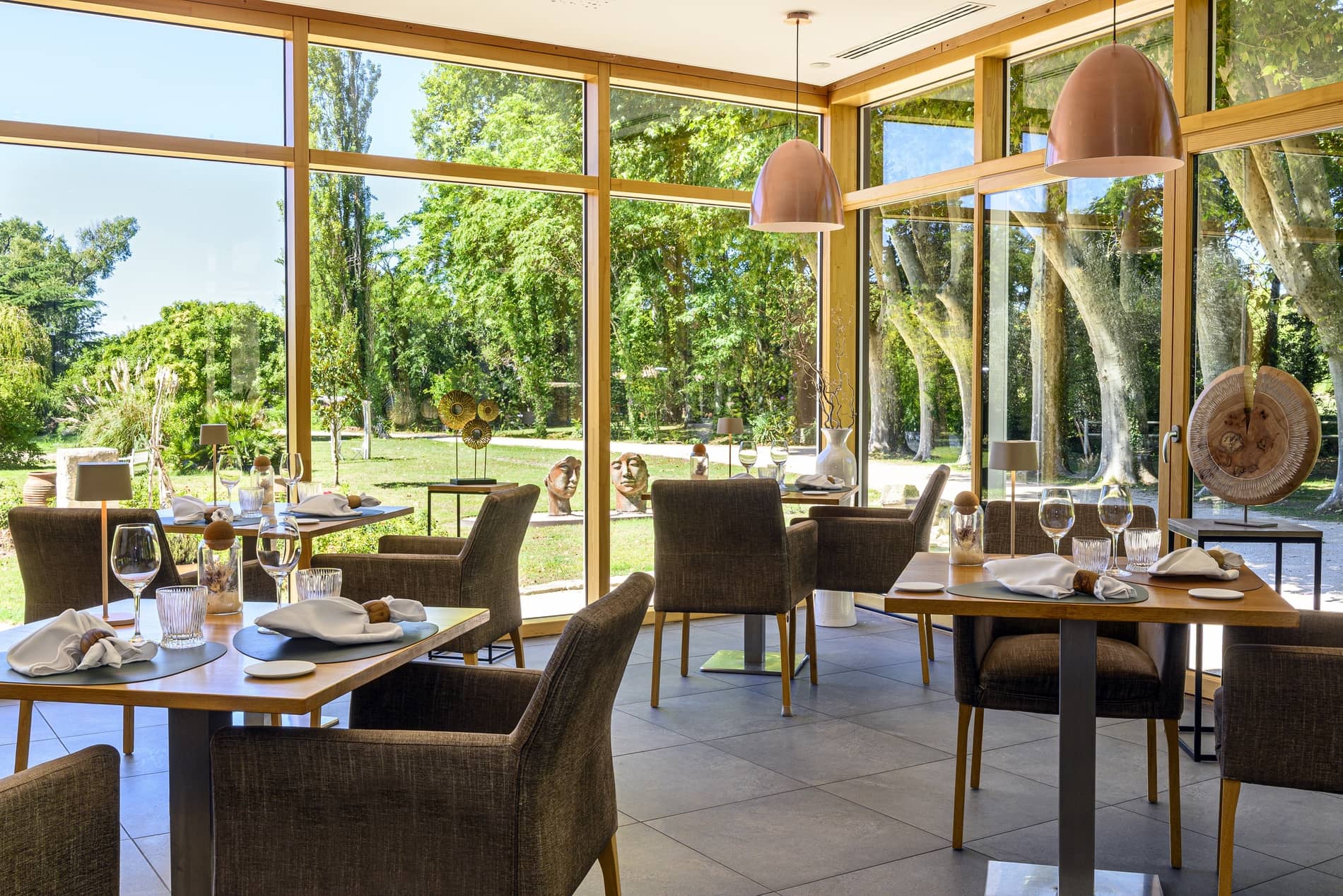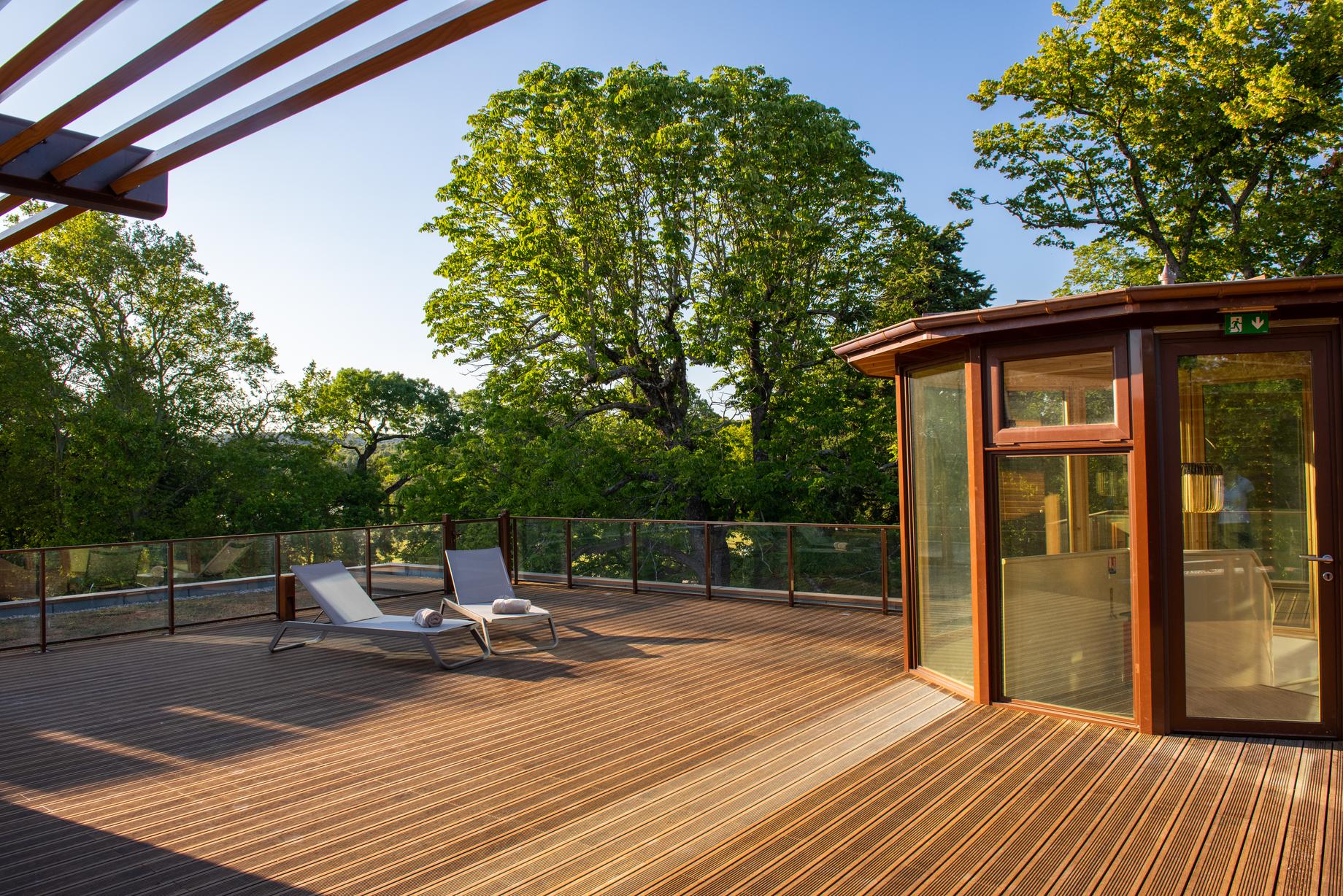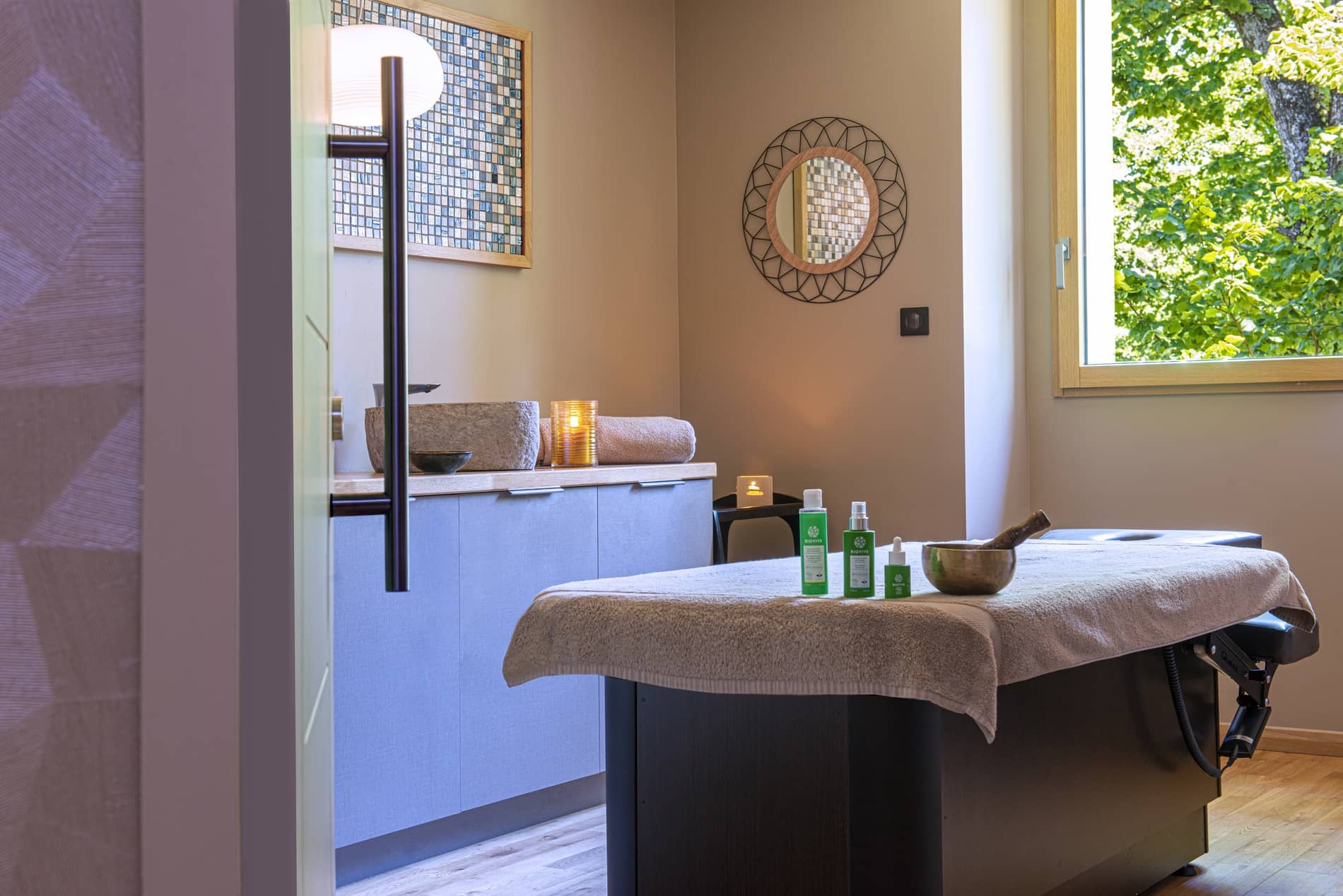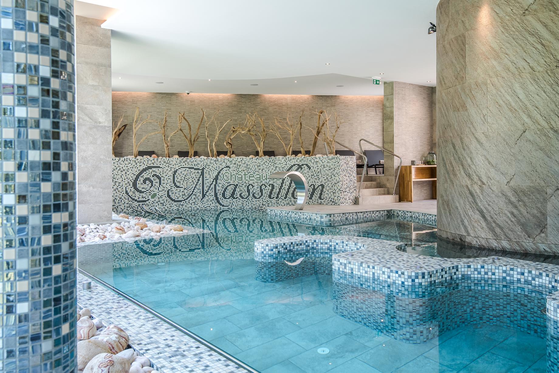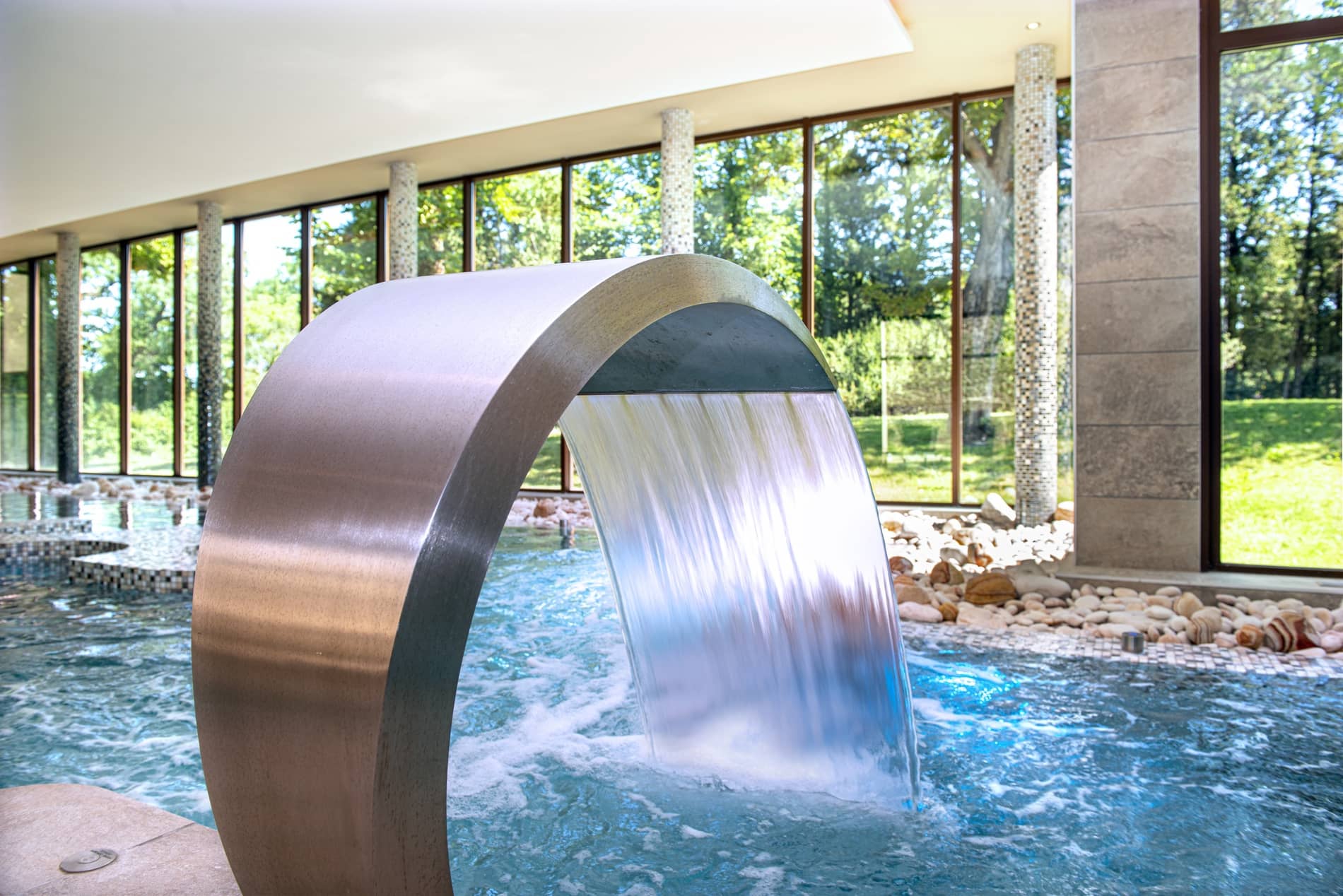 Piscine intérieure du Bio Spa avec grande baie vitrée donnant sur le parc