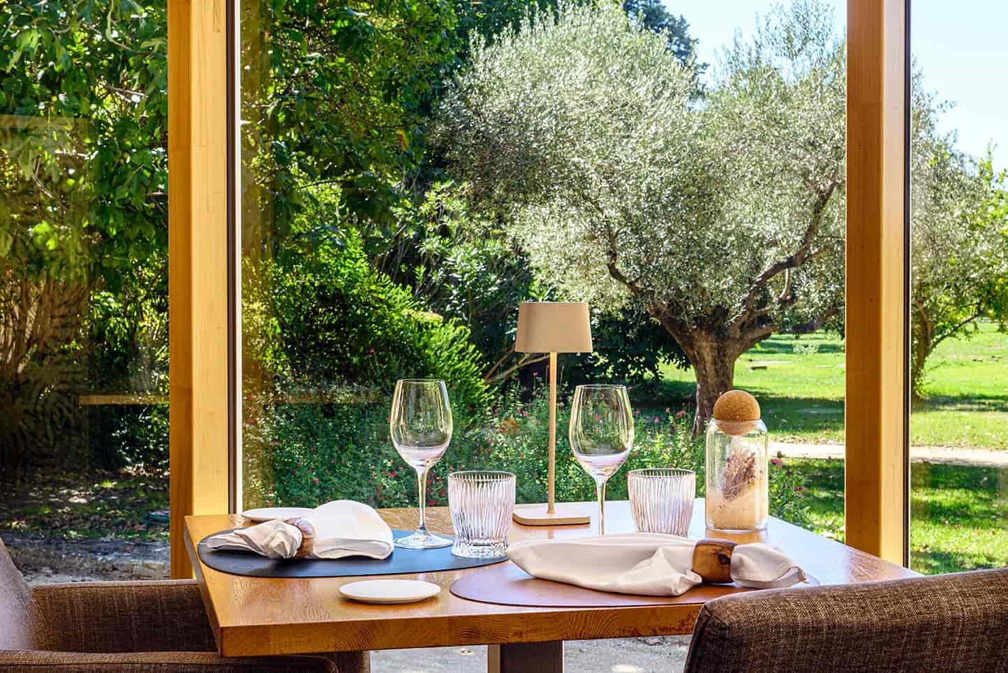 The dining room of Château de Massillan’s restaurant in Uchaux offers a modern setting, adorned with striking green tones visible through the large picture windows overlooking the magnificent park, its avenue of century-old plane trees, and its bucolic pond.