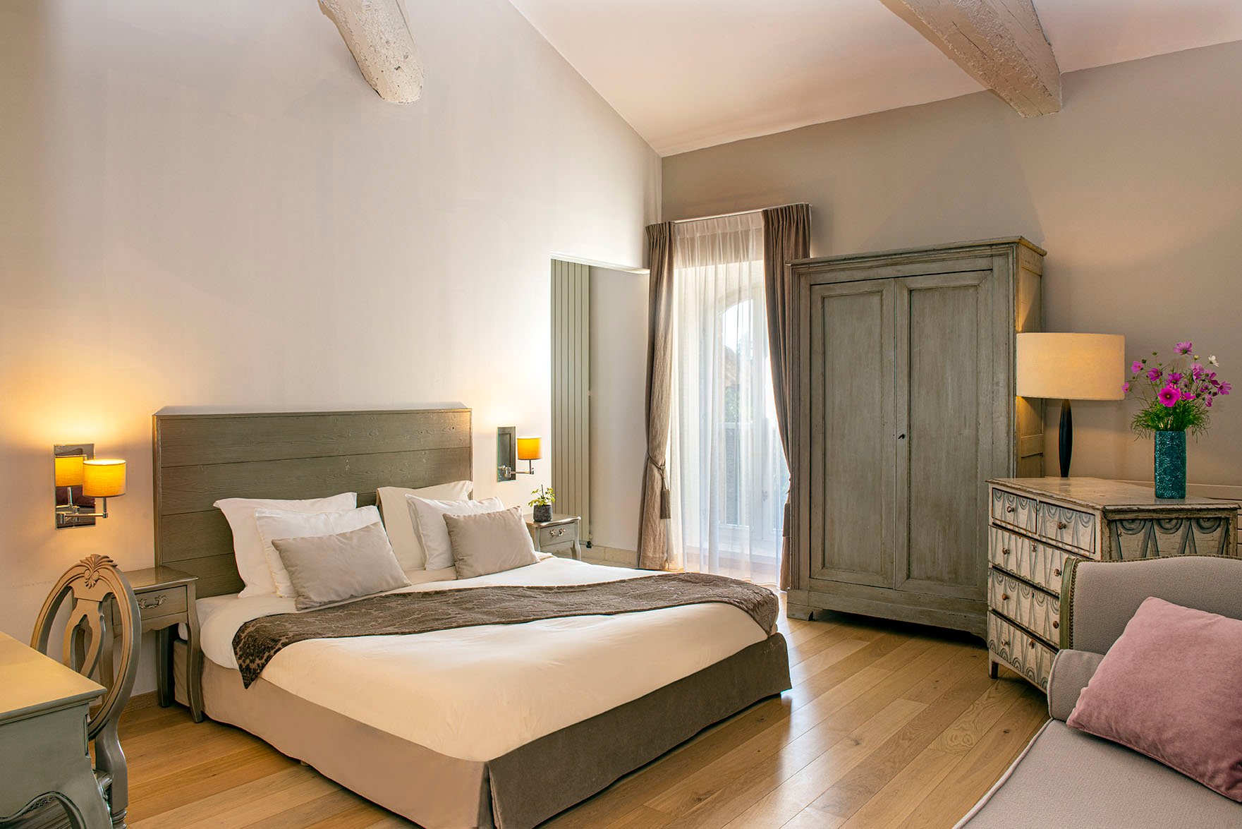 Our traditional rooms are in the bastide wing, part of the main building. In those modern rooms, you can enjoy the view on either the main courtyard or on the olive tree courtyard. The bathrooms, with natural stone design, features a countertop basin and walk-in shower.