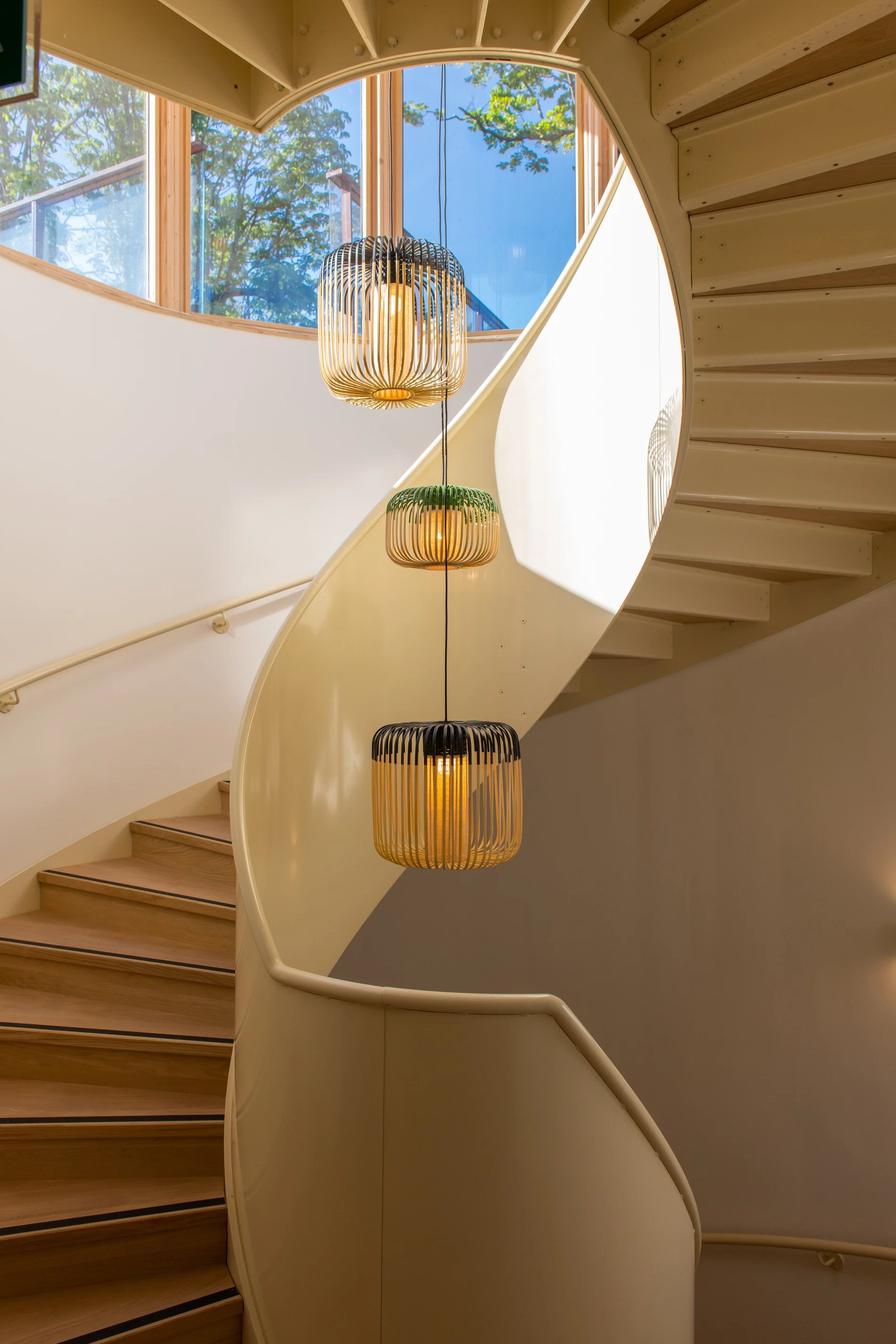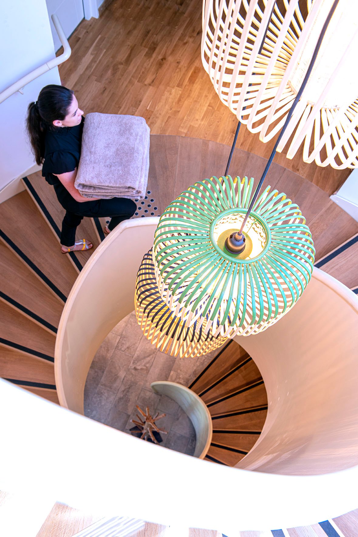 Une toiture-terrasse solarium de 200m² vaste et confortable, est idéale pour se reposer ou simplement flâner à l’abri du soleil avec ses pergolas en bois sur mesure et ses transats à disposition. Vous y accédez par le majestueux escalier circulaire en chêne et sa tour ronde vitrée.