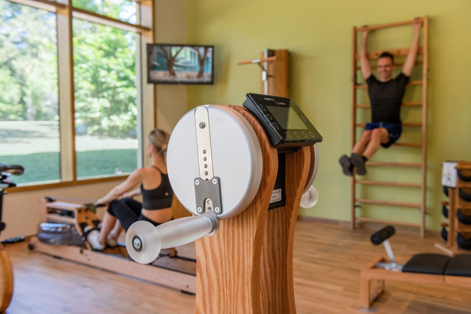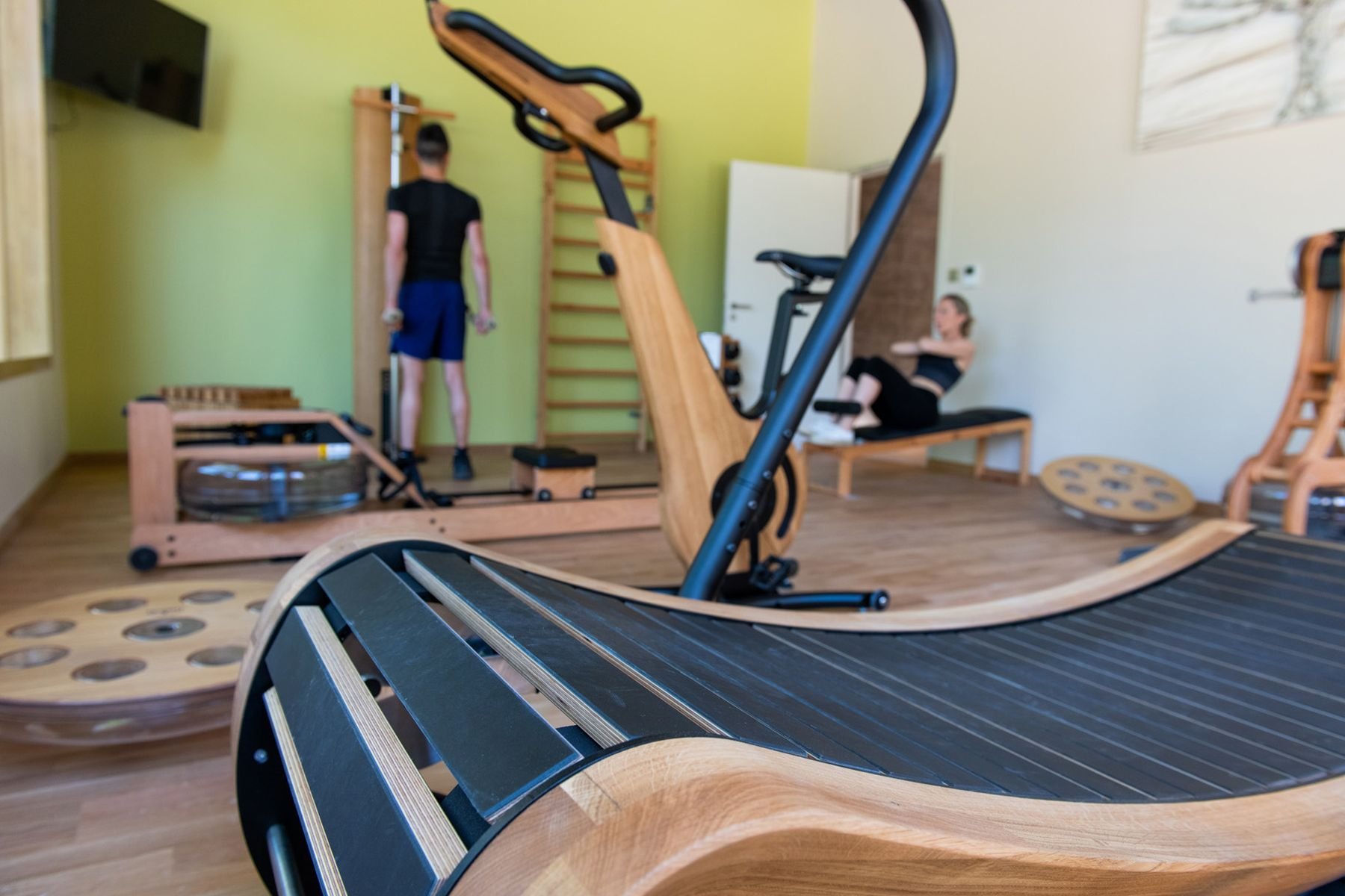 Une salle de sport, ouverte sur la nature et l’entrée majestueuse du château. L’ensemble est en chêne (parquet, menuiseries et bien sûr les magnifiques appareils de sport). Vous découvrirez nos appareils qui fonctionnent sans électricité mais avec la puissance de l’eau. A disposition ; tapis de course, vélo, rameur, banc incliné, espalier, vélo à bras, plateau de Freeman, des poids, ballons de gym…